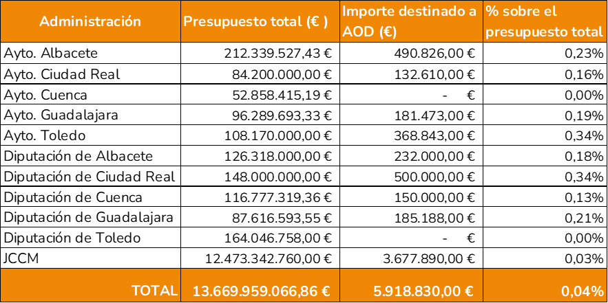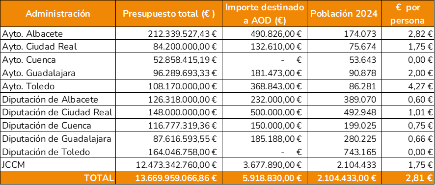 1. Durante el ejercicio 2024, el conjunto de administraciones públicas analizadas en este estudio —la Junta de Comunidades de Castilla-La Mancha, las cinco diputaciones provinciales y los ayuntamientos de las cinco capitales de provincia— destinó un total de 5.918.830 € a acciones de Ayuda Oficial al Desarrollo (AOD). Esta cifra representa el 0,04 % de sus presupuestos consolidados, lejos del compromiso internacional del 0,7 %.