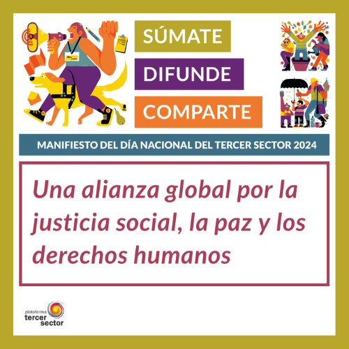 En este Día Nacional del Tercer Sector, invitamos a todos los actores sociales: organismos internacionales, gobiernos, empresas, agentes sociales, universidades, medios de comunicación y a toda la ciudadanía, a que se sumen a una alianza global por la justicia social y los derechos humanos. De forma conjunta, podemos enfrentar los desafíos globales con soluciones locales. Solo a través de un esfuerzo colectivo podemos garantizar un futuro donde la justicia social no sea solo una aspiración, sino una realidad tangible para todas las personas. Nuestro trabajo es un ejemplo del poder de la colaboración y la unidad en la creación de un mundo mejor. Este manifiesto reafirma nuestra convicción de que podemos construir una sociedad en la que todas las personas tengan una oportunidad de prosperar. Que este Día Nacional del Tercer Sector sea un hito en nuestro camino hacia un futuro mejor, marcado por la colaboración, la justicia social, la paz y la defensa de los derechos sociales y humanos.