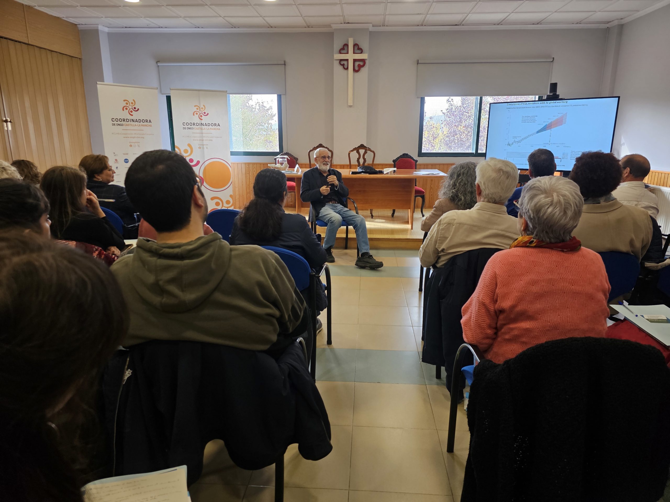José Manuel Moreno Rodríguez, Catedrático emérito de la UCLM desarrolló la ponencia Cambio Climático: Hacia un Mundo más Cálido y Seco en Nuestras Latitudes. «La tierra no ha conocido algo así en mucho tiempo» dijo refiriéndose al calentamiento global dejando claro que «el futuro dependerá de lo que hagamos”.